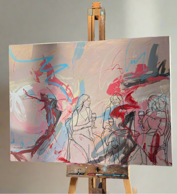 Painting No7 of the series, This painting celebrates the hazy beauty of time spent with friends. The blurred edges, the fragments of memory that feel more like sensations than fixed events. The chaotic abstract background mirrors the energy and chaos of shared experience, while the linear figures gathered on a balcony over wine ground the scene in togetherness.